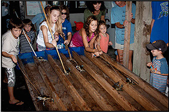 Pamlico Sound is rich with blue crabs, locally referred to as hard crabs. The hard crab races are designed for little children. Each child is assigned a crab in a lane. When the chute opens, the cheering and gentle prodding begins as they encourage their crab to head for the finish line. The crabs don't always cooperate and the children enjoy their antics as the crabs sometimes go every way but in the right direction.